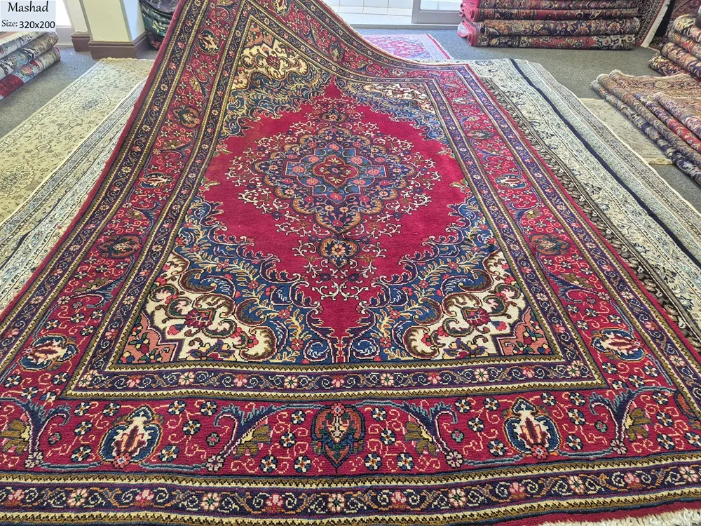 Pre-loved Hand-knotted Mashad rug, Size: 320 x 200 cm, natural wool & vegetable dye. R13 000 valuation certificate.