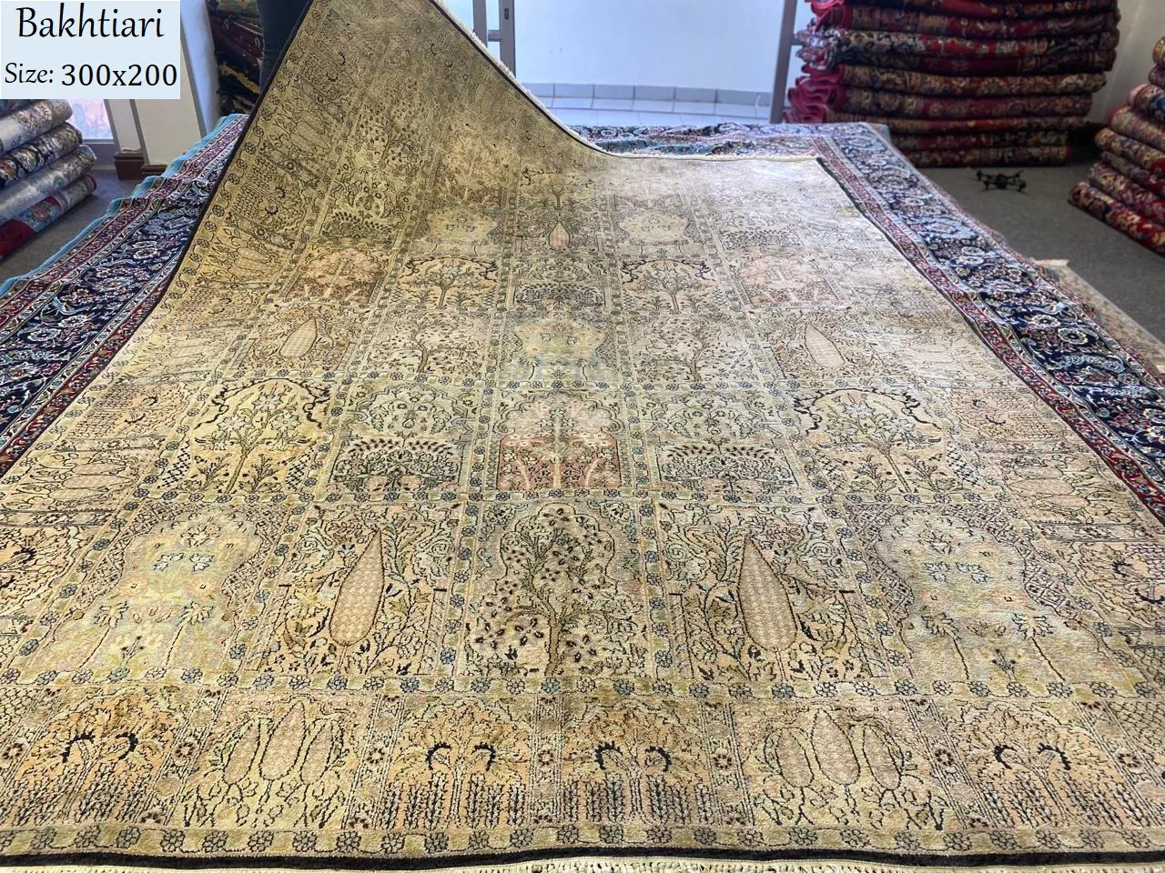 Silk Bakhtiari rug, Size: 300×200 cm, Garden of Heaven pattern, Hand knotted, mixture of silk & cotton, R45 000 valuation certificate, Imported from Iran.