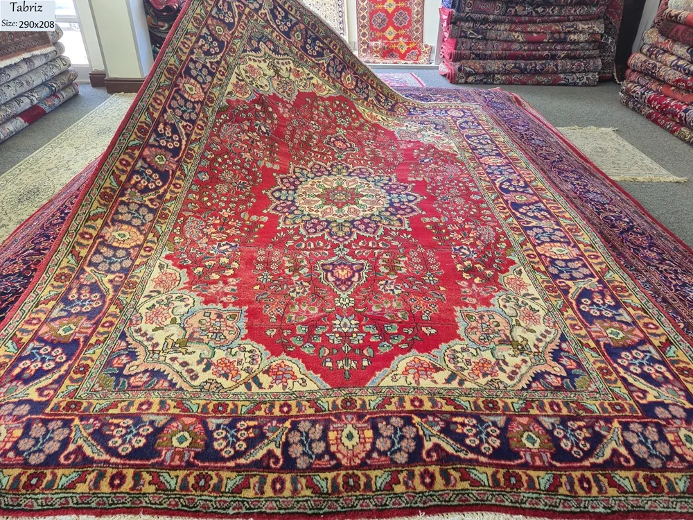 Tabriz Persian Rug is a hand knotted masterpiece of classical artistry, Size: 290×208 cm, Showcases a complex floral design with a prominent central sunburst medallion and ornate corner spandrels.