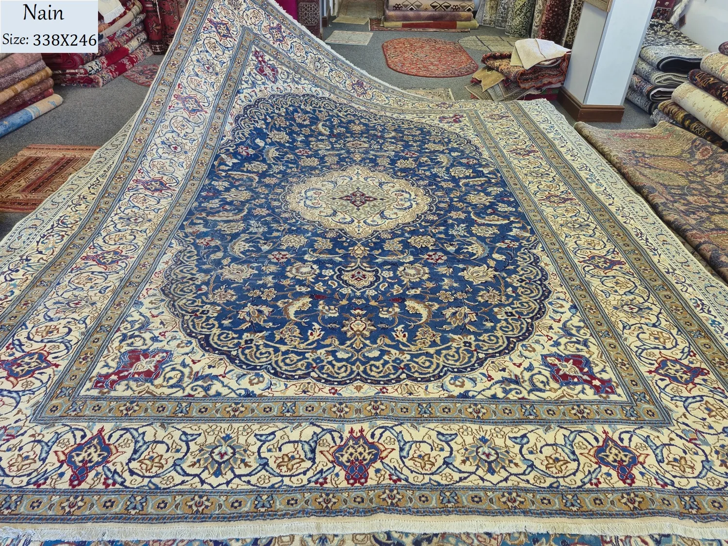 Stunning handmade blue Nain, Size: 338×246 cm, Pre Loved fine knotted by natural wool & vegetable dye, R30 000 valuation certificate.