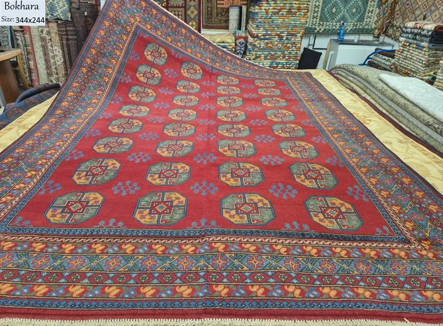 Handmade red Bokhara, Size: 344×244 cm, Afghan rug, Hand knotted by fine wool & vegetable dye, R25 000 valuation certificate.