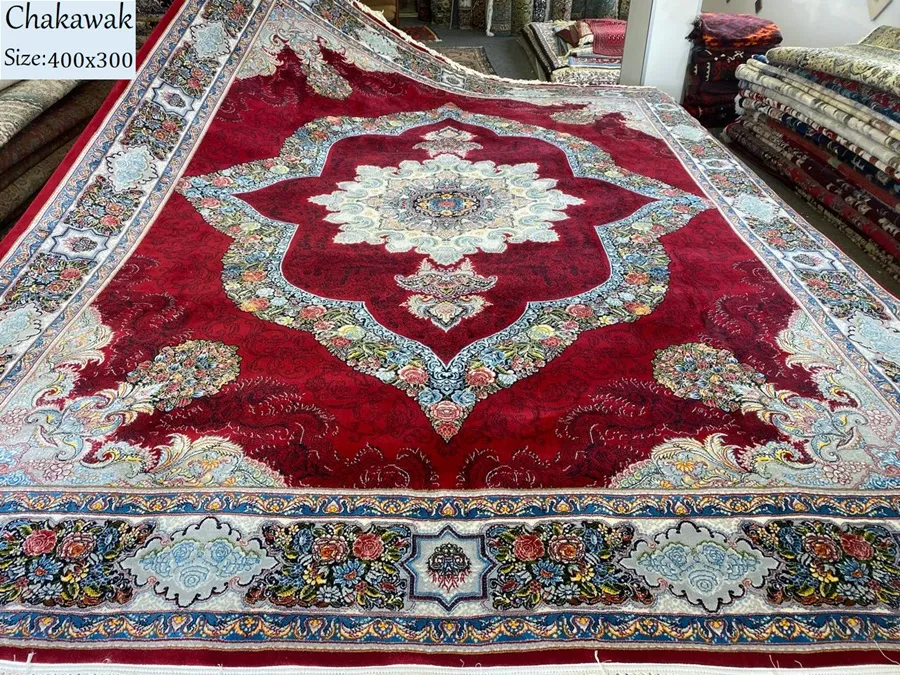Royal Chakawak carpet, Size: 400×300 cm, red color, 700 knots quality, machine made, R16 000 valuation certificate & exchange warranty, Imported from Iran.
