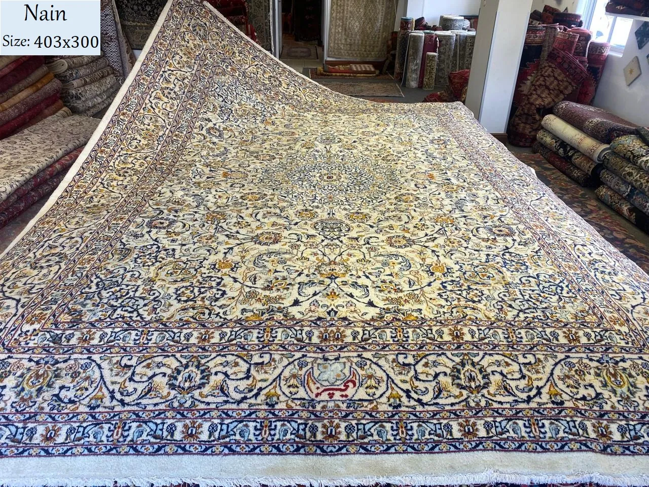 Persian handmade Nain carpet, Size: 403×300 cm, fine hand knotted artist signature by natural wool & vegetable dye, R28 000 valuation certificate & exchange warranty.