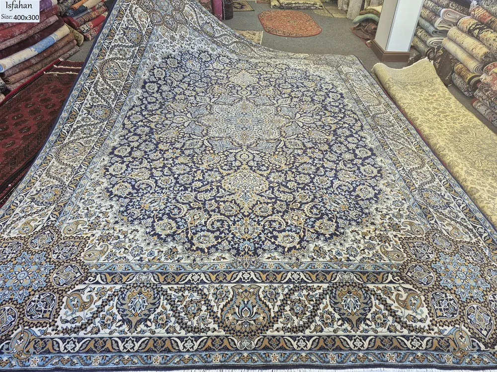 Pre-loved Persian Isfahan carpet, Size: 400×300 cm, navy, wool on cotton, 400 Knots quality, R14 000 valuation certificate.