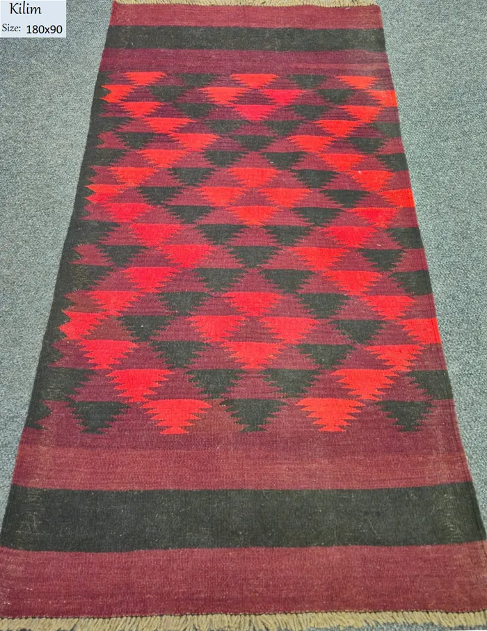 Hand-woven Afghan wool Kilim runner rug, Size: 180 x 90 cm, featuring a geometric pattern in shades of red, burgundy and black.