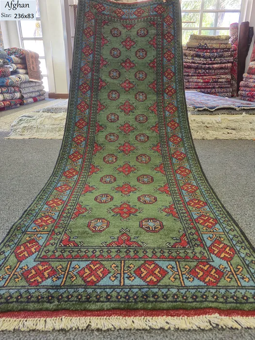 Hand-knotted Sage Green Afghan Hallway runner, Size: 236 x 83 cm, featuring traditional tribal patterns, High-quality wool.